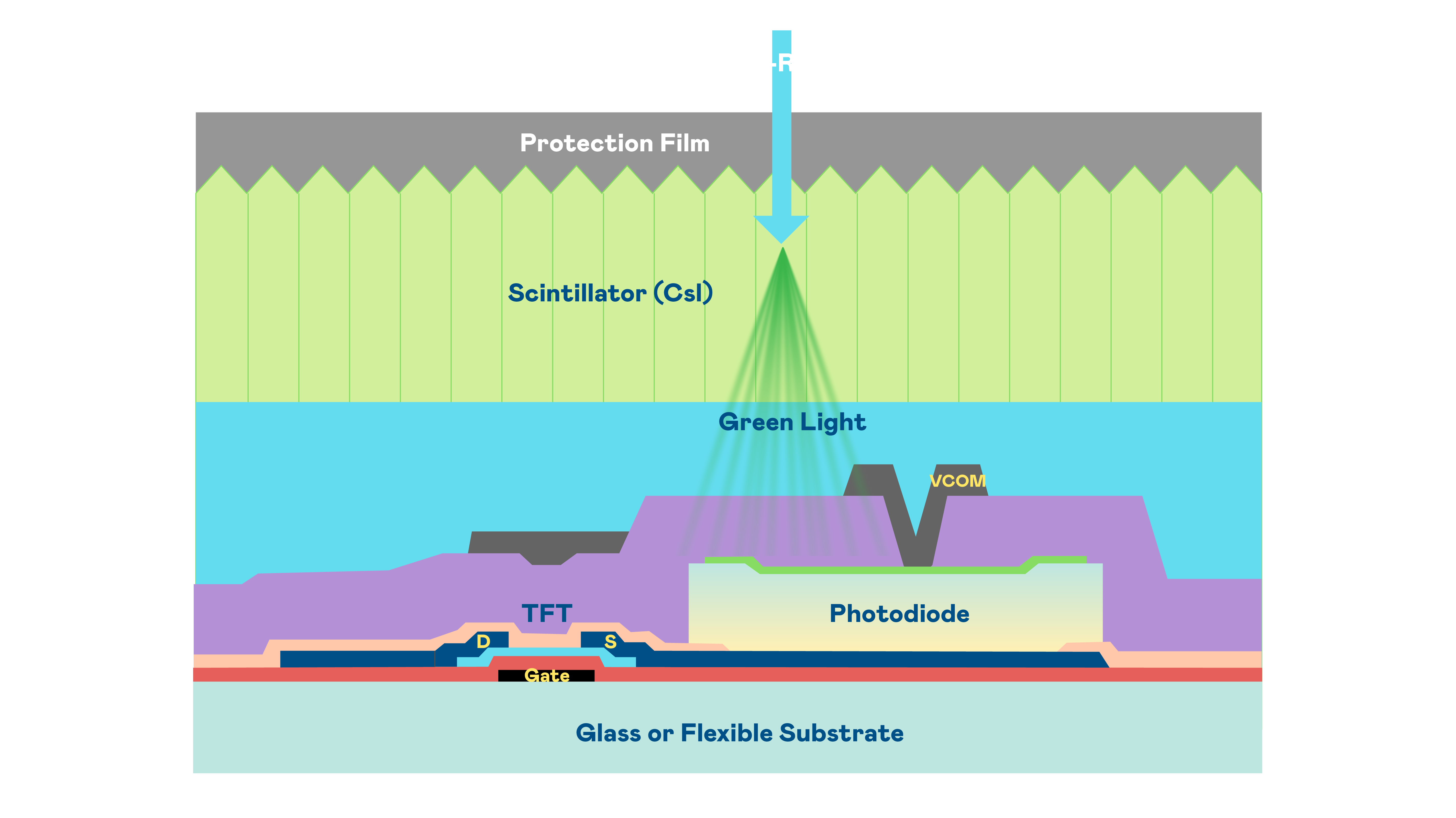w66利来的X光影像感測陣列使用薄膜電晶體 (TFT) 作為每個像素的讀取開關,搭配光電二極體(Photodiode)的光電轉換元件,用以感測X光影像訊號。